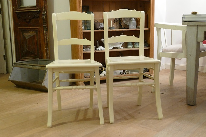 2 identische alte Stühle in schöner Form, gelblich-weiß gestrichen.